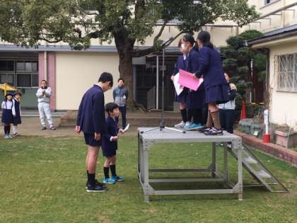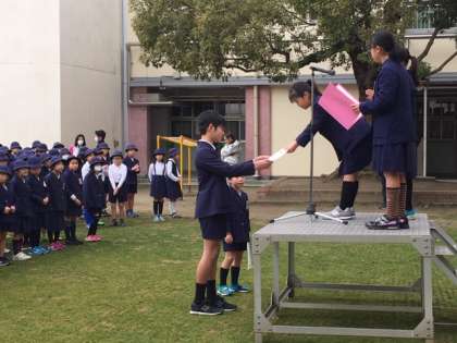 また、保健委員会からは先月の手洗いうがい週間にて頑張っていたクラスとして1年1組が、また同週間時の調査でハンカチ・ティッシュを忘れずに持ってきていたクラスとして6年2組が表彰されました。