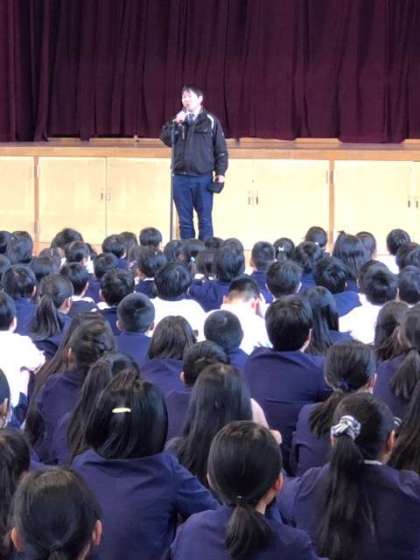 講堂では警察の方から、「おはしも」の合言葉をもとに友だちとぶつかったりして怪我をしないようにということや、自分の命は自分で守ることが大切であるという話を聞きました。その後、教頭先生からは、2001年に起きた附属池田小学校の話や、チャイムや笛などが鳴ったりと普段とは違う様子のときは、静かにして放送や先生の指示を聞くこと、門を開けっぱなしにして帰ったりしないことなどの話がありました。講堂に集まってからの全児童は静かにしっかりと話が聞けてました。