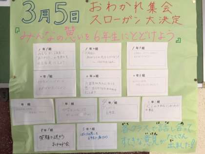 1年生〜5年生までの各クラスで話し合って出た意見をもとに代表委員会で話し合った結果、「みんなの思いを6年生にとどけよう」に決まりました。