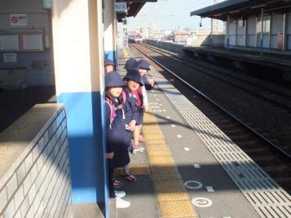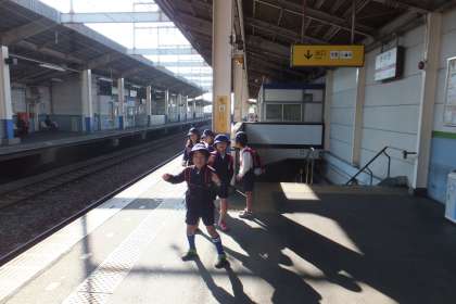 子どもたちは、自分たちで切符を買ってホームに向かいます。子どもたちは、ホームで見守る先生の顔を見てちょっと安心。電車に乗り込んでいきました。