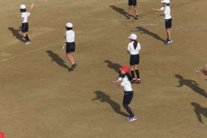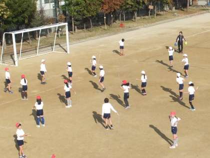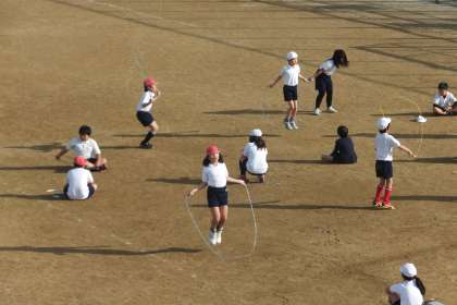 準備体操の後に縄跳びをしました。「2分跳び」や「1分跳び」、「あや跳び20回」などいろんな跳び方をして、体を温めました。