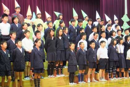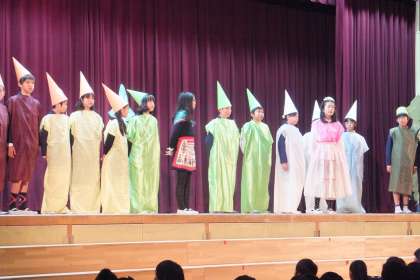 暗転や歌の間に衣装を身に着け、子どもたちがかわるがわる役を演じます。セリフにも気持ちを込め、とても上手に演じることができました。