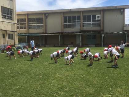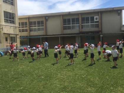 「もっと大きく〜!」という先生の声に合わせて、元気に体操していました。
