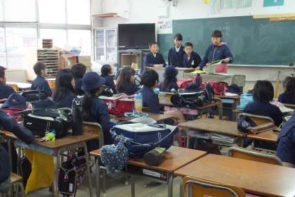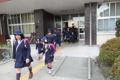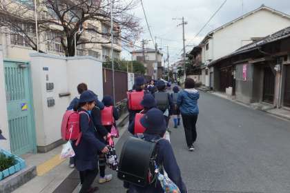 最初に集団登校班ごとに集まり、3学期も安全に登下校できるように2学期の反省をしました。