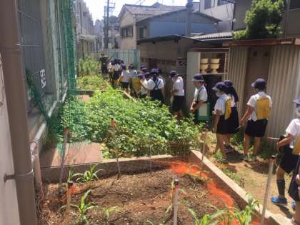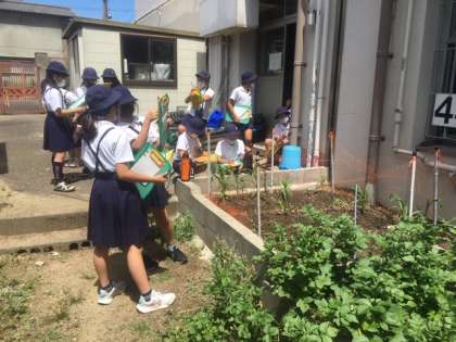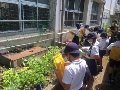 理科室の裏に植えているトウモロコシやジャガイモ、ヘチマ、ダイズ、ヒョウタンの中から好きなものを選び、葉の形や大きさなど観察して分かったことをカードにかいていきました。
