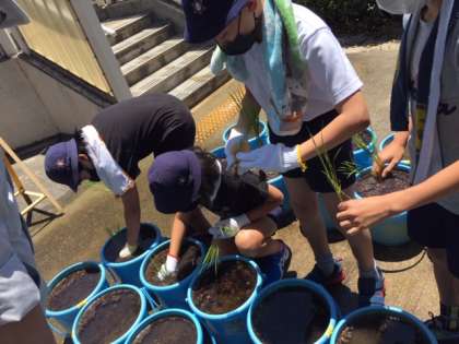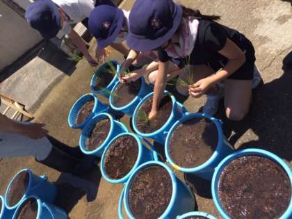 5年生は総合学習の一環でバケツ稲栽培を行います。