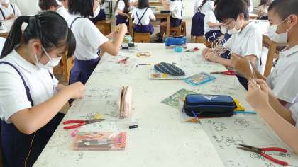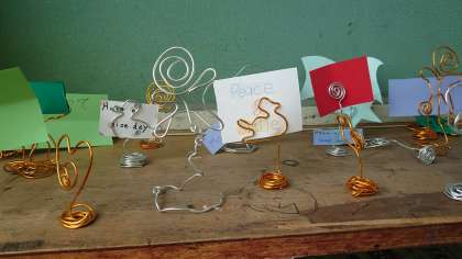 6年生は図工の時間、1人1mの針金を使ってメッセージスタンドを作りました。