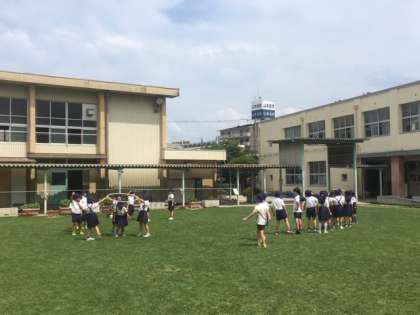 音楽で学習した「ロンドン橋」を中運動場でみんなで遊んでみました。