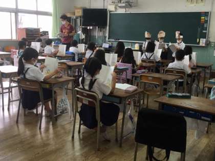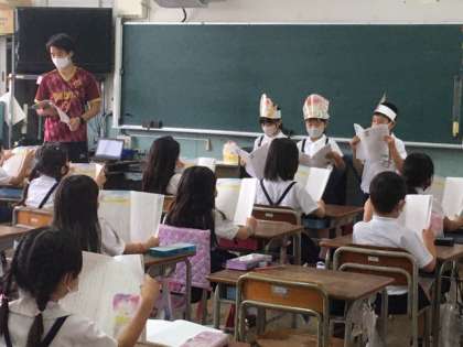 登場人物役の児童は、それぞれ何の役をしているかが分かるように、頭にイラストをかぶって演じました。