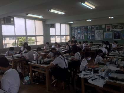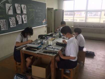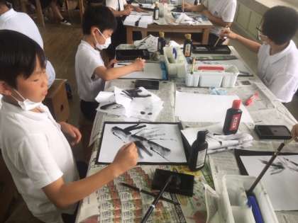 墨の濃淡を生かして幹や葉を描いていき、最後は自分の名前の漢字一字を赤ペンで落款風につけたしました。