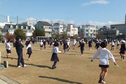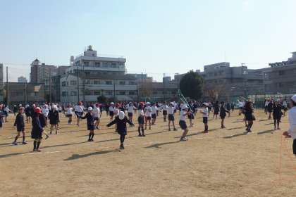 みんな、音楽が始まる前からおのおのの跳び方で縄跳びをしていました。さすがに4〜6年生は体力も技能も高く、二重跳びやあや跳びを織り交ぜながら、5分間を跳びきりました。