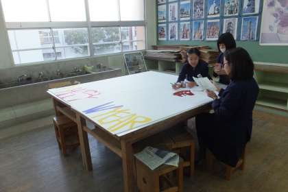 12月9日(火)、恒例になった駒川商店街の正月用吊り下げ看板の制作が、6年生の有志によって始まりました。