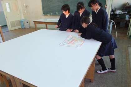 1日目の今日は、デザインを決めて下書きに取り掛かりました。今年は、裏表1枚、2つのデザインを手分けして描きました。出来上がったところから、早速、色塗りを始めるグループもありました。