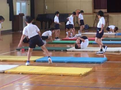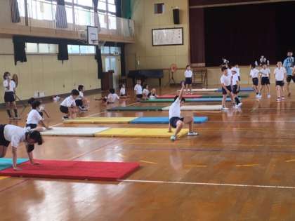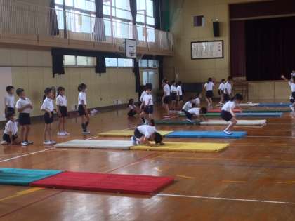 「前転では背中を丸くしようね。」という先生の指導をよく聞いて、しっかりと意識して回っていました。また、同じ班の友だちに対して、回り方のアドバイスをしている様子も見られました。