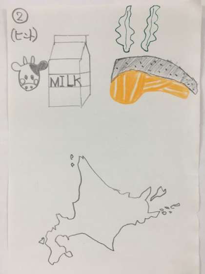 続いて2の都道府県のヒントですが、左の牛乳、右のサケ、コンブどれもここが作っている(とれる)量が一番多い食べ物です。