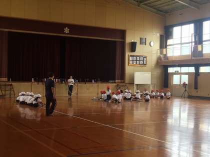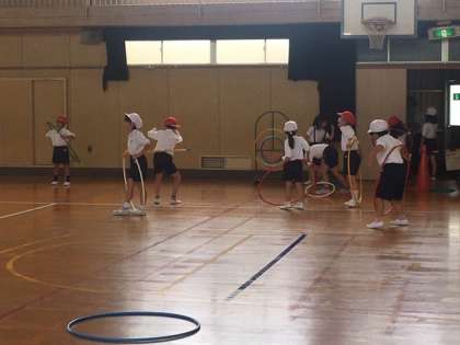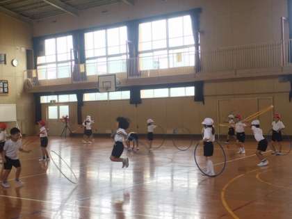 体を使って回したり、なわとびのように輪を回して飛んでみたり、転がして追いかけたりと色々な遊び方を試していました。
