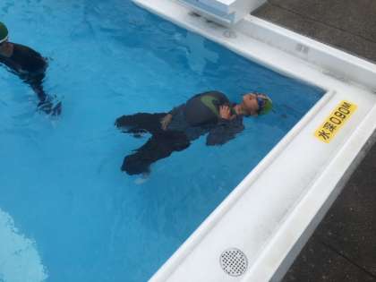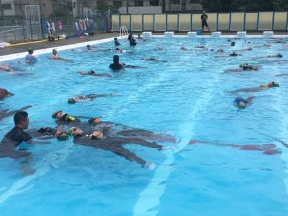 走ったり泳いだりする活動の後は、浮く活動をしました。服を着て仰向けで浮く活動では、いつもと勝手が違うために、いつも上手に浮くことができている児童でも、最初力が入ってしまったり、手足を余計に動かしてしまったりして上手に浮くことができずに苦労している姿が見られました。