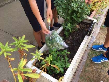 子どもたちから意見として出た植物にポリ袋をかぶせ、しばらくたってから空気の成分を測るという方法で実験をしていきました。