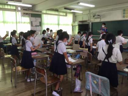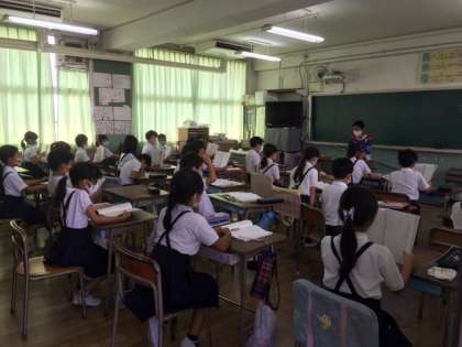 題名はみんなで読み、その後は自分が音読したい一文を選び、その場所が来たら起立して読むという活動をしていました。