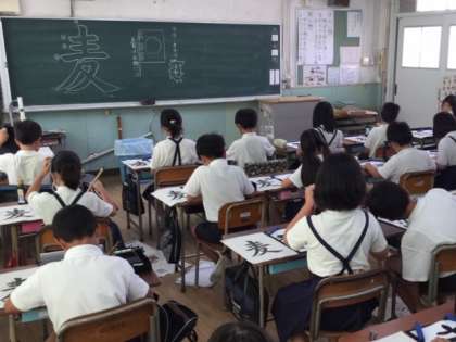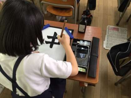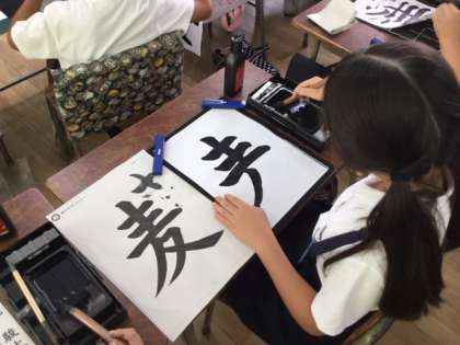 お手本を見ながら横画同士の間隔や左右のはらいを意識して、集中しながら筆を動かしていました。