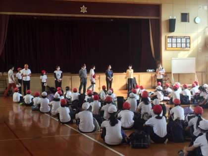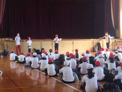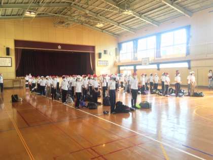 講堂での出発式では、代表の児童の言葉や付き添いの先生の紹介などがあり、最後にみんなで「行ってきます!」とあいさつをしてバスに向かいました。