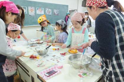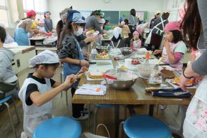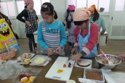 カチカチカチカチという音が、家庭科室に響きます。続いて、ケーキに飾るイチゴなどの果物を思う思うの形に切っていきました、泡立ったクリームに塗り、デコレーションを始めました。