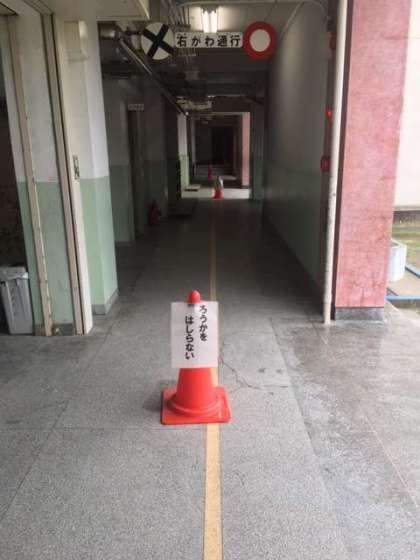 残念ながらろう下を走っている姿が多く見られたので、昨日から1階のろう下に写真のようなコーンが設置されています。