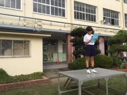 校長先生の話に引き続き、担当の児童から日曜日に行われた運動会の得点発表がありました。