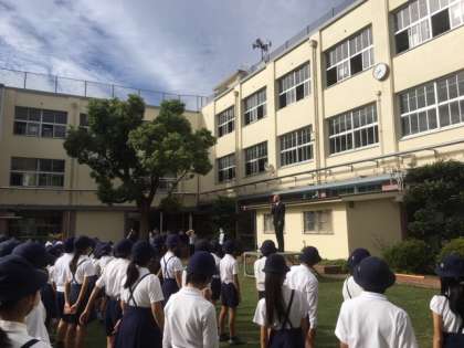 今朝は久しぶりに中運動場で児童朝会を行いました。