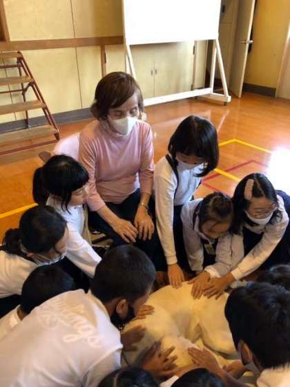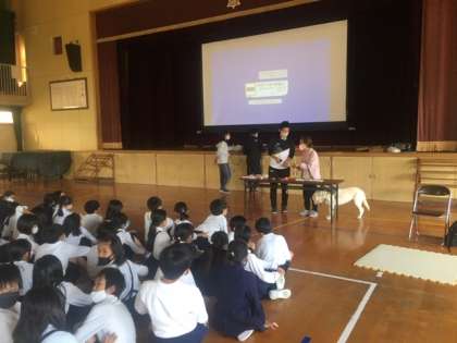 今日は盲導犬フェリシアと、その飼い主であるYさんを招いて、盲導犬や視覚障がいについて学習しました。