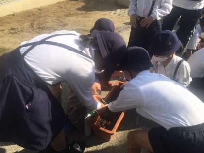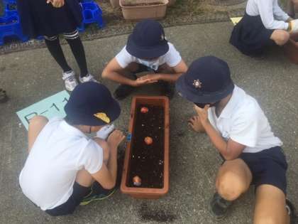 プランターに土を入れる時や球根を植える際には、4年生が中心となり、3年生と協力しながら作業を進めていました。