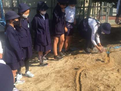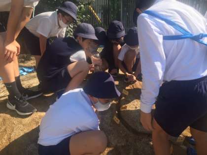 砂山に川に見立てて溝を掘り、そこに水を流すことで曲がっている流れの外側が削られていくことを確かめました。