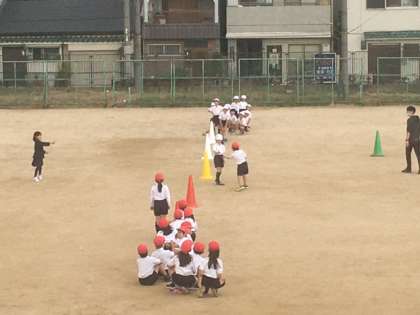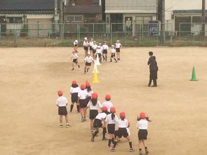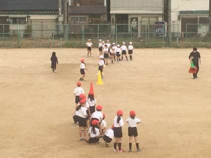 普通に走るだけでなく、ボールを股に挟んでぴょんぴょん跳ねたり、向かい合って走ってきて、出会った場所でじゃんけんしたりと、様々な活動をしました。