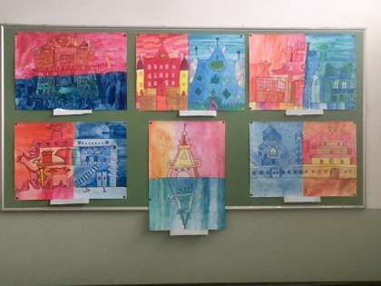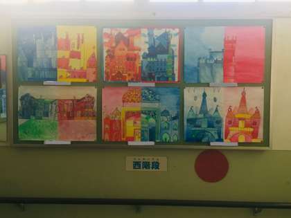 今5年生が廊下に掲示している「炎の城 氷の城」という題材の絵画です。