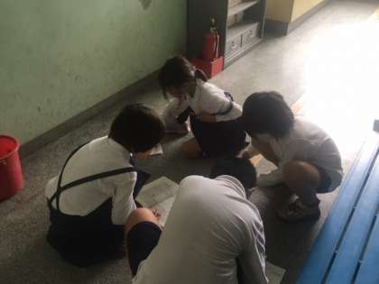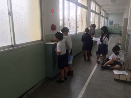 消防署について勉強をしてきたのですが、学校にも火事を防ぐための工夫があるので、それをみんなで探してまわりました。