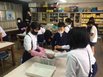 空気を温めるとどうなるかという実験をしました。丸底フラスコに栓をして、お湯で温めると。。。