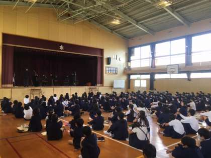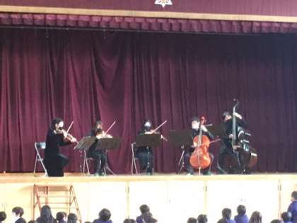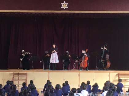 通常の弦楽四重奏(バイオリン2、ビオラ、チェロ)にコントラバスを加えた編成で、「アイネクライネナハトムジーク」「くるみ割り人形」などの有名なクラシック曲をはじめ、アニメの曲、教科書に載っている曲など、たくさんの曲を演奏してもらいました。また、ソプラノ独唱や、楽器紹介もあり、盛りだくさんな内容でした。