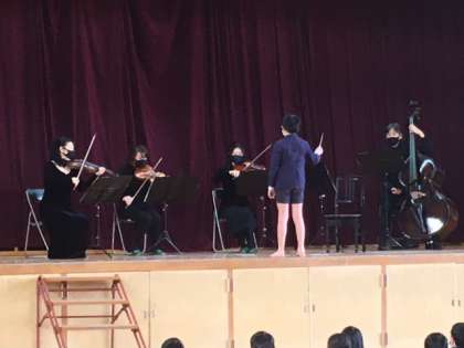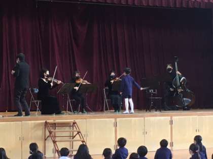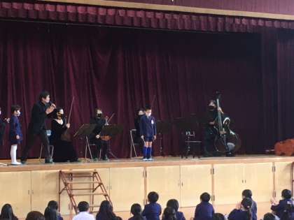 そのほかにも「だれでも名指揮者」という指揮体験では、各学年から1人ずつが舞台にあがり、指揮者の体験をしました。子どもたちが指揮棒を振る速さや幅に合わせて、曲のテンポや音量が変わるので、面白いのと同時に指揮者の役割・大切さがよく分かりました。