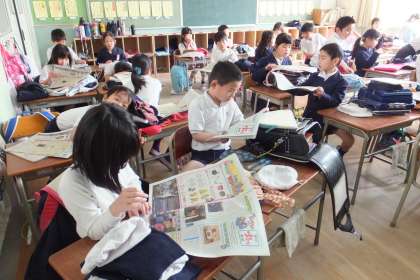 2月5日(木)、2年生の終わりの会の様子です。配っているのは、今日の小学生新聞です。本校では、昨年10月から、各学級で小学生新聞を購読しています。