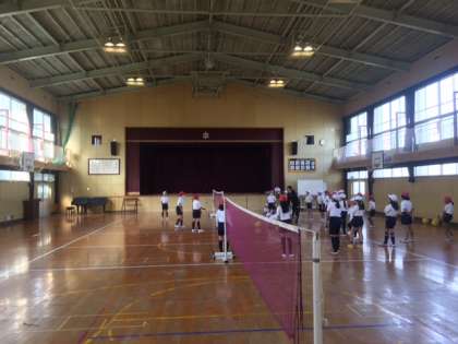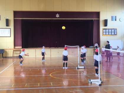 今日はまず、サーブをレシーブする際はキャッチしても良いこと、その後トスを上げ相手コートに打ち返すことなど、試合の際のルールをみんなで確認しました。
