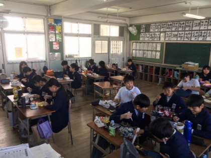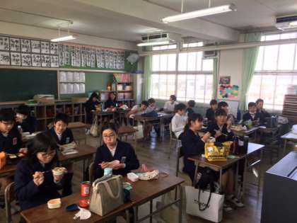 中止になったけれども給食が止まっているため、今日のお昼は教室でお弁当を食べました。
