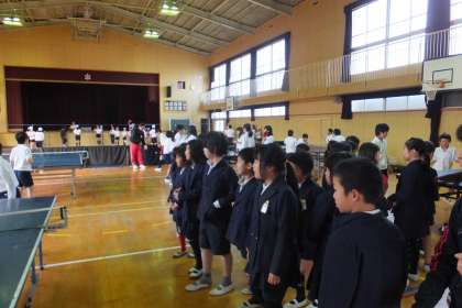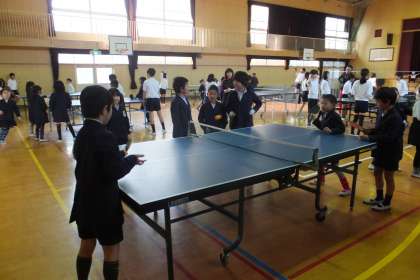 体育館での卓球クラブ・バドミントンクラブの見学の様子です。