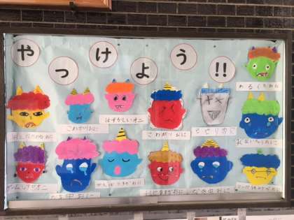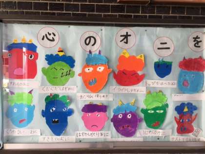 毎年2月の玄関掲示では、2年生の子どもたちが心の中から追い払いたいオニを描いたものを掲示します。