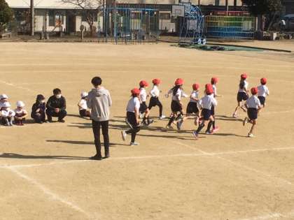 赤組・白組でペアになり、一人が走り、もう一人が何周走っているか数えていました。