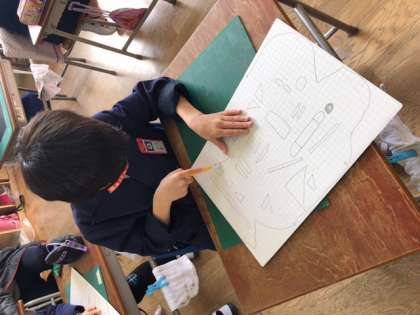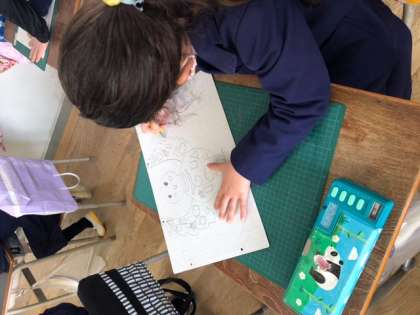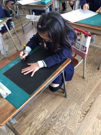 今日は下絵を描いた厚紙をカッターナイフで切りぬいていきました。