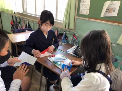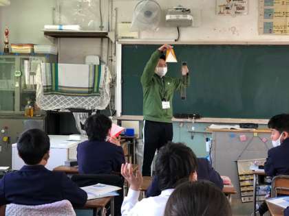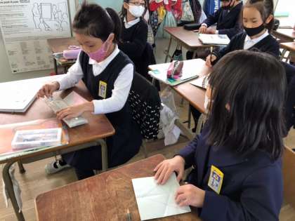 折り紙を折って正三角形を作り、そこから正三角形の特徴について調べました。