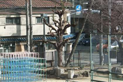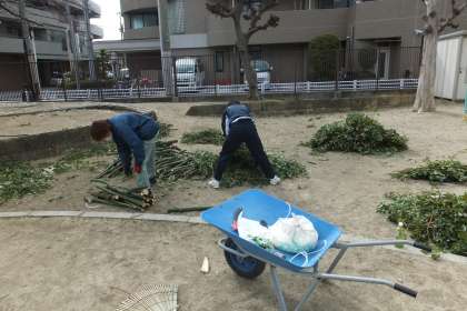 仕事の内容は、管理作業員さんが剪定した東運動場の大きな樟の枝を集めて運び出す作業です。冷たい風が吹く中で、黙々と頑張ってくれ、本来なら2日かかる作業を1日で終わらせました。管理作業員さんから、「明日の仕事も考えなあかんな」と言われ、ニッコリしていました。