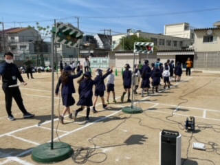 模擬信号機を使って、横断歩道の渡り方や、駐車車両など障害物がある場合、どう歩行するかなど学びました。