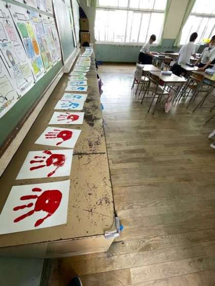 クラス目標の掲示に使う、手形を一人ひとり取っていきました。