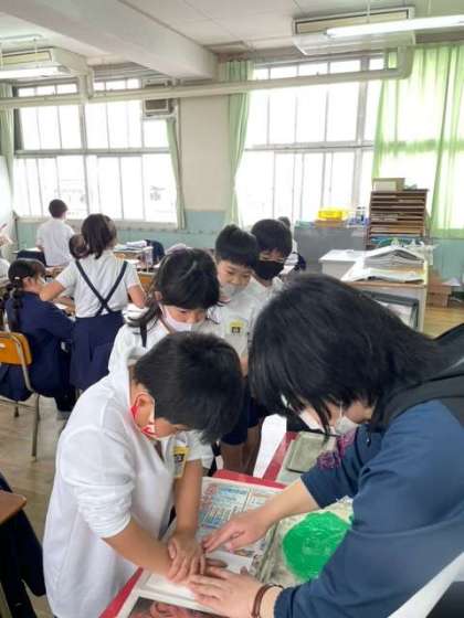 みんなの手形を並べて乾かす時に、「わぁ、レインボーや。」「僕の手、大きい。」と楽しそうに話していました。